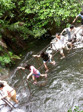 后來天氣稍好之后,我們開始渡過吊橋,前往玄真天溪谷探險(xiǎn)。有些人在步入吊橋的時(shí)候,故意左搖右晃,以期嚇阻膽小的女生。然而陰謀自然是不會得逞的,沒有一位女生是膽小怕事的。想我道可視的女生們個(gè)個(gè)豪情萬丈,堪比木蘭紅玉。